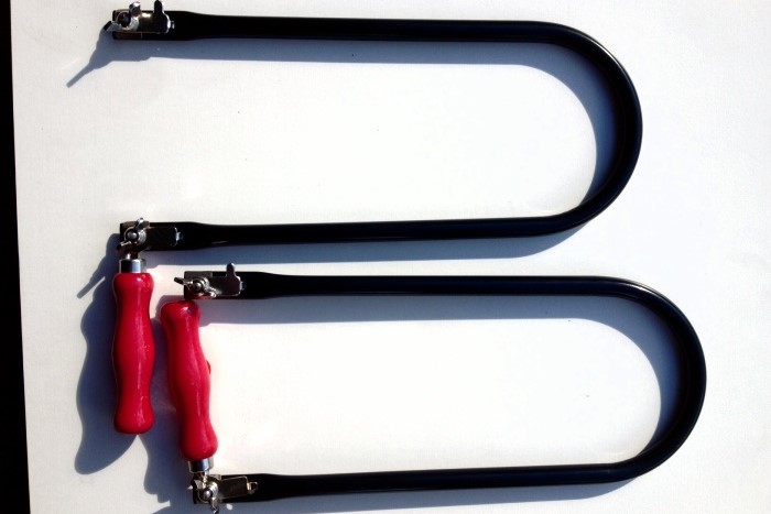 Laubsäge, Stahlrohr 13mm, schwarz lackiert, Spezial-Spannplättchen, Stahlflügelmuttern, feinlackiertes Buchen-Holzheft, gehärtete Schrauben.