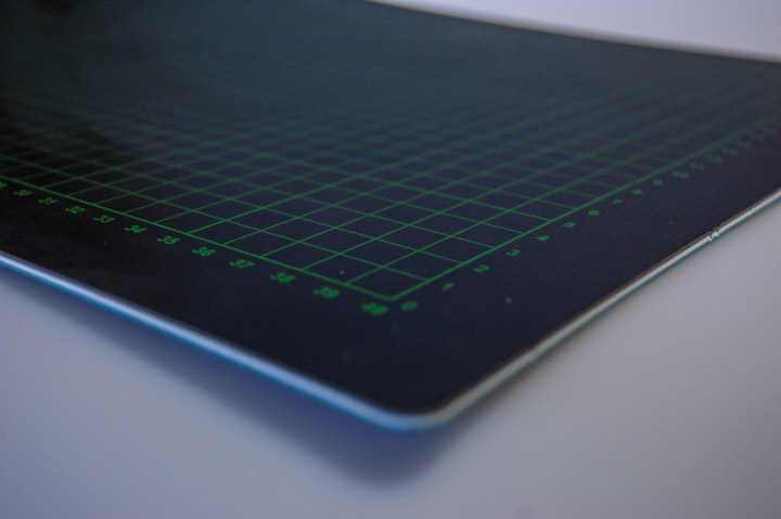 Das mehrlagige, 3mm starke Kunststoffmaterial hat eine harte Mittelschicht und ist mit normaler Schneidearbeit kaum zu zerstören. Die beiden Oberflächen sind elastischer und weicher. Sie nehmen dadurch den Schnitt auf und mildern ihn ab. Die Schärfe der Klinge wird geschont. Die Oberflächen sind selbstheilend. Das bedeutet, dass sich die Schnittlinie wieder schließt und fast unsichtbar wird.