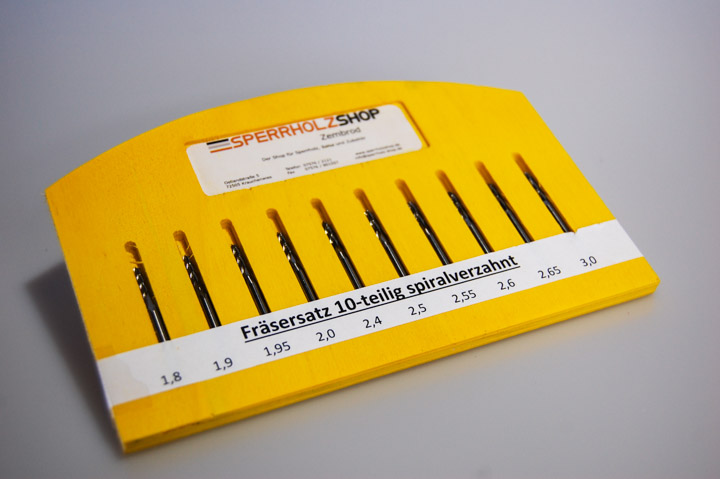 - Satz besteht aus jeweils 1 Fräser im Durchmesser: 1,8mm, 1,9mm, 1,95mm, 2,0mm, 2,4mm, 2,5mm, 2,55mm, 2,6mm, 2,65mm, 3,0mm